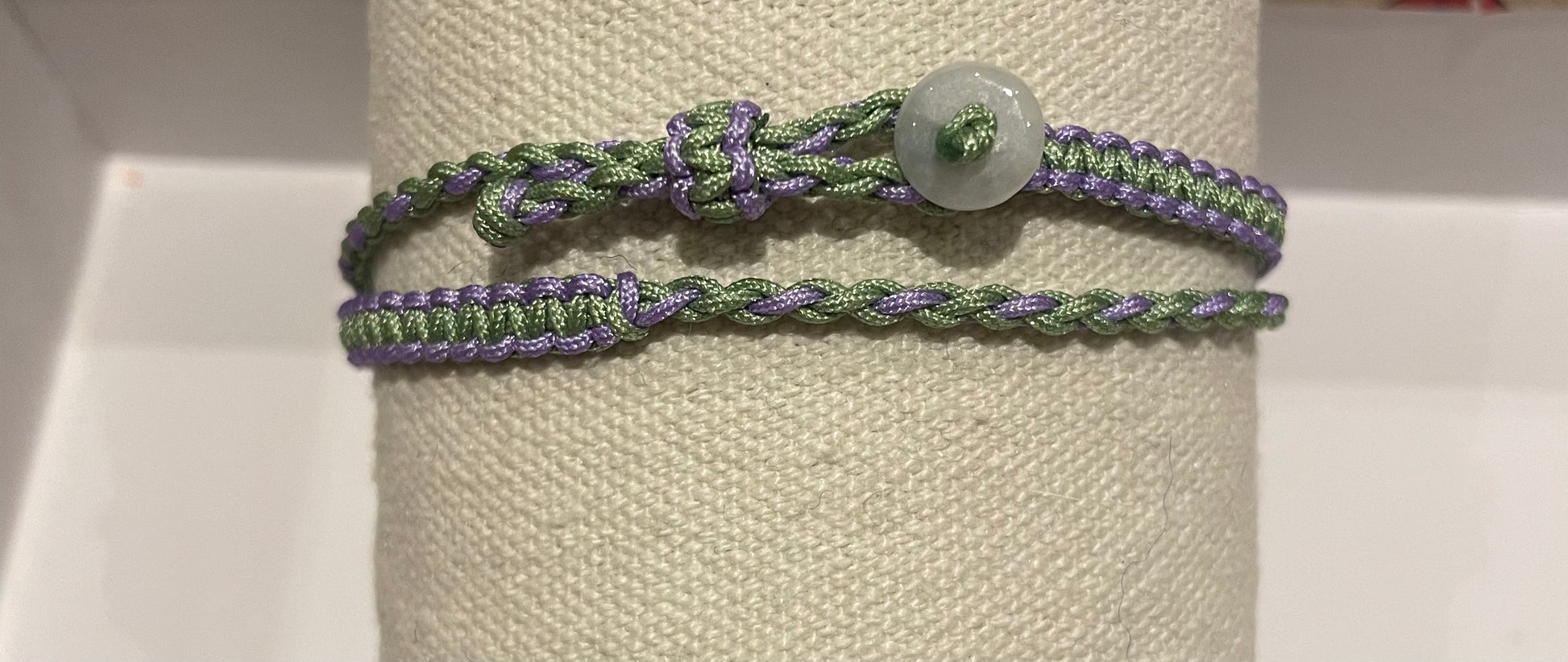 The string is in light green and purple colour which length is suitable for different wrist size.