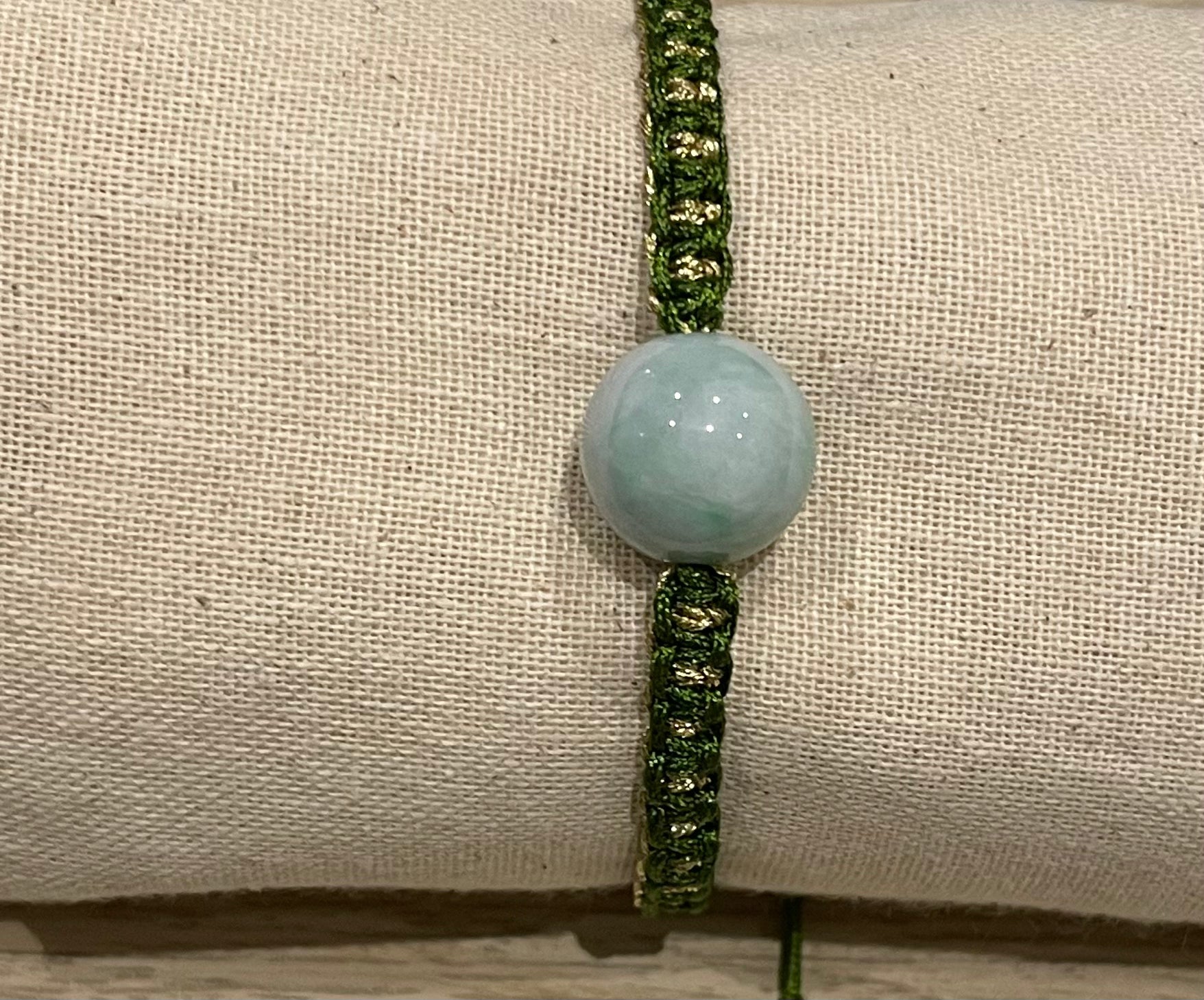 The string is in olive green and gold colour, its length is 16.5cm or longer with an adjustable sliding knot. The diameter of the jade bead is 13mm.