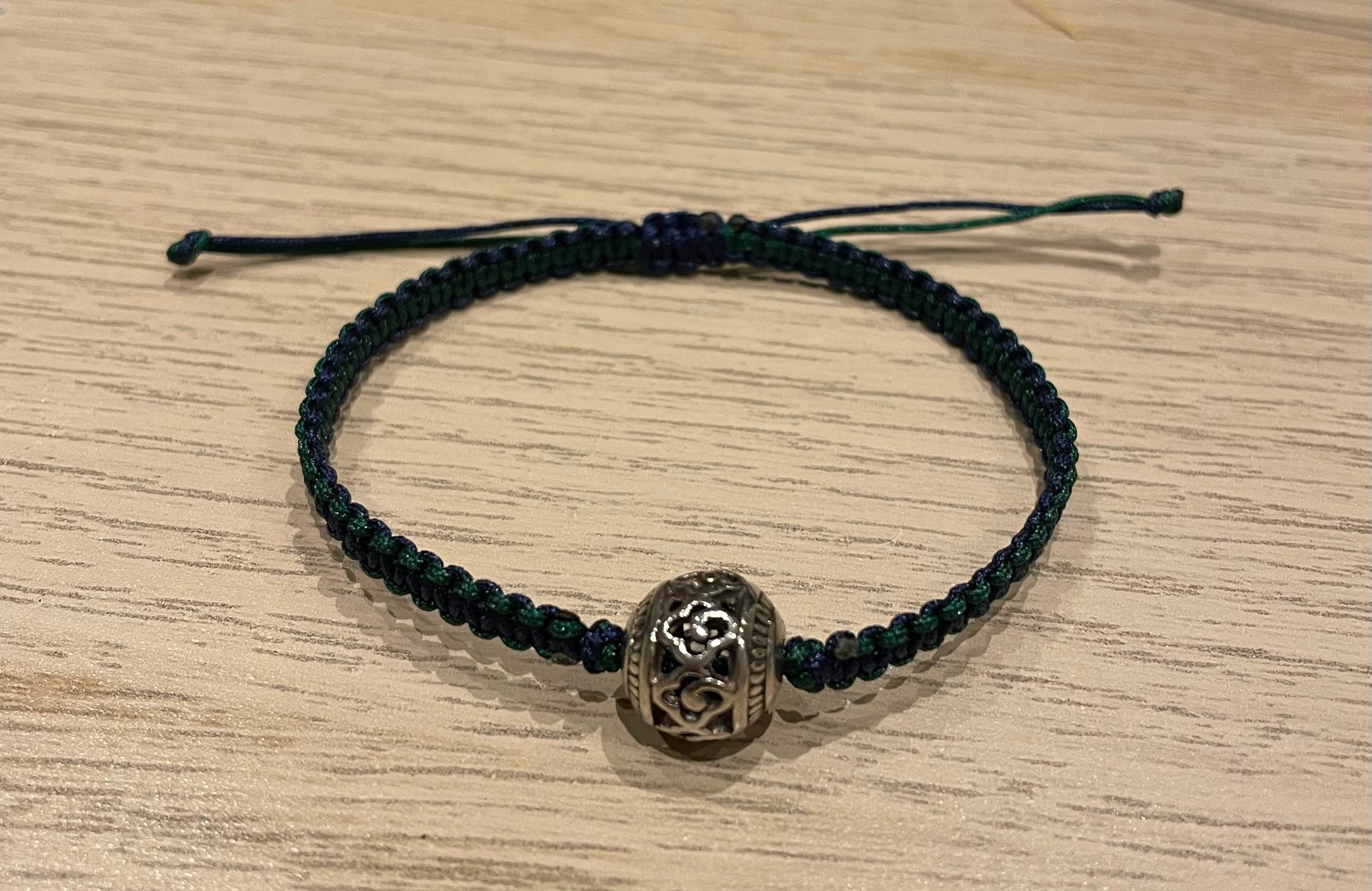 The string is in dark blue and dark green colour, its length is 17cm or longer with an adjustable sliding knot.